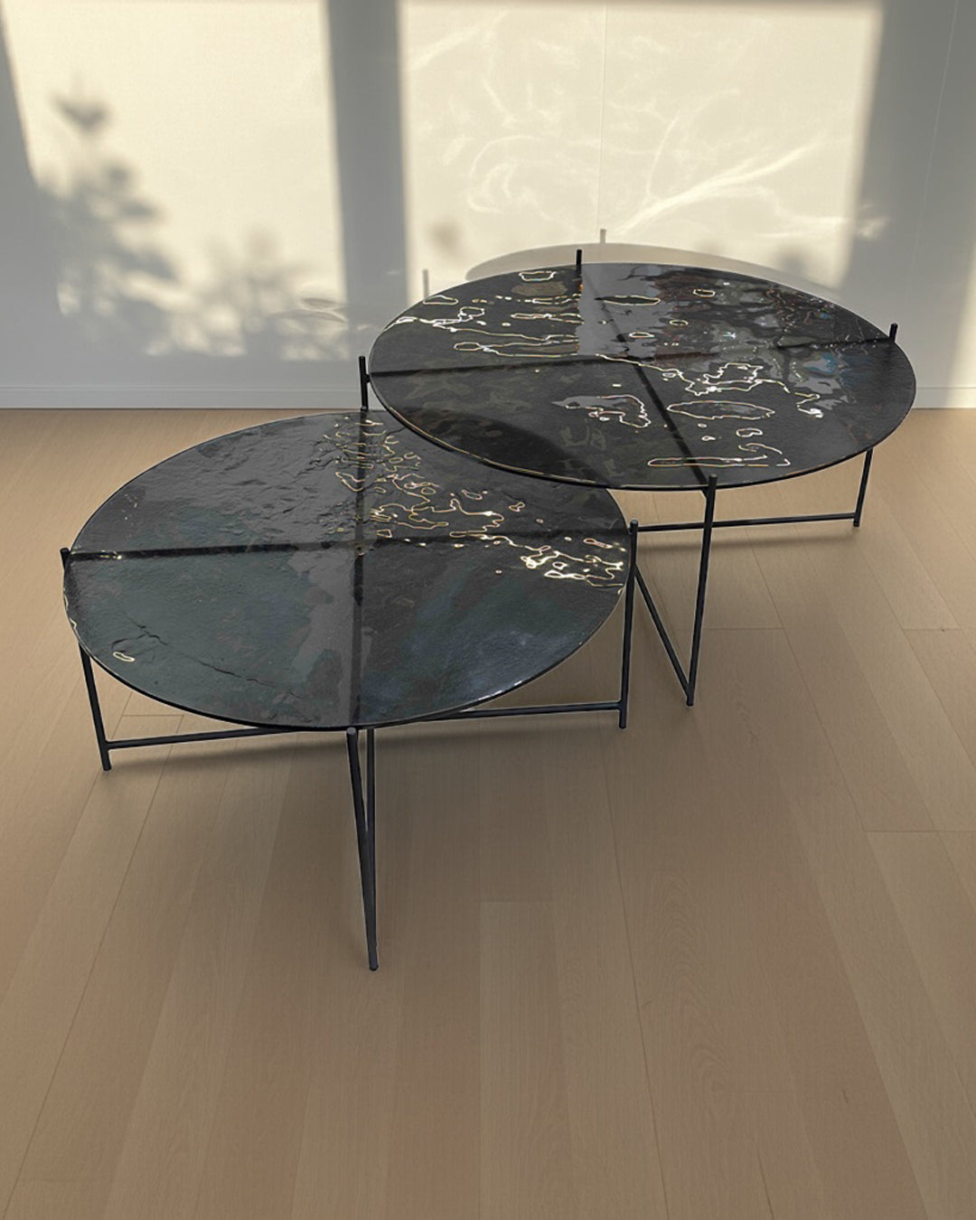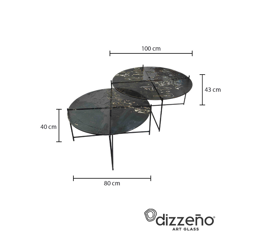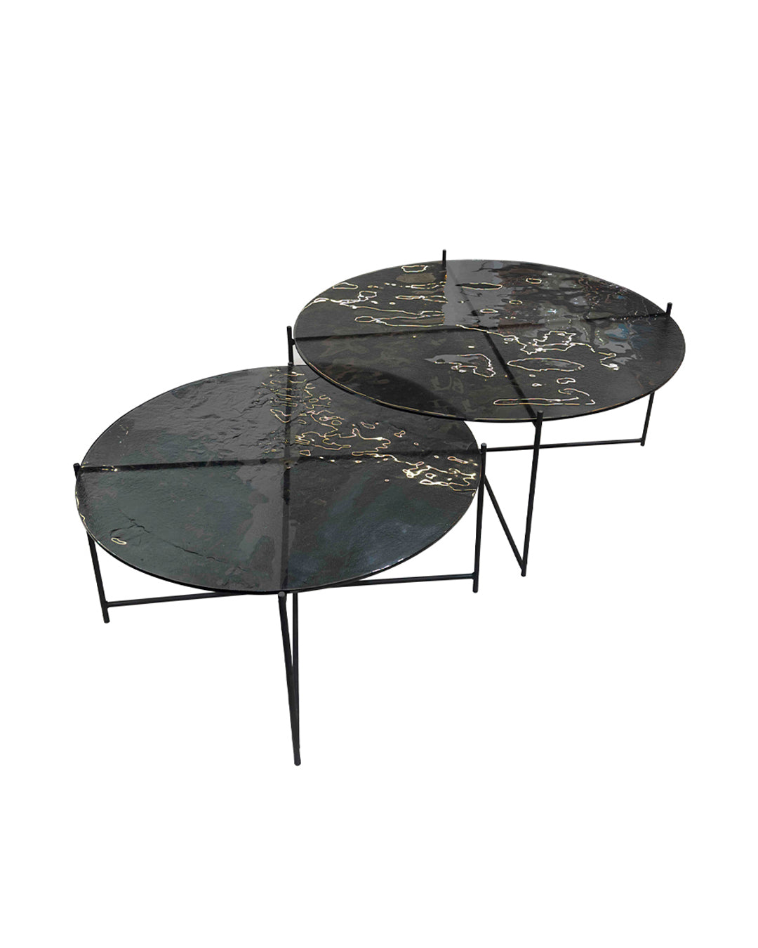 Elegante set de mesas decorativas de metal con cubierta de vidrio termoformado.
