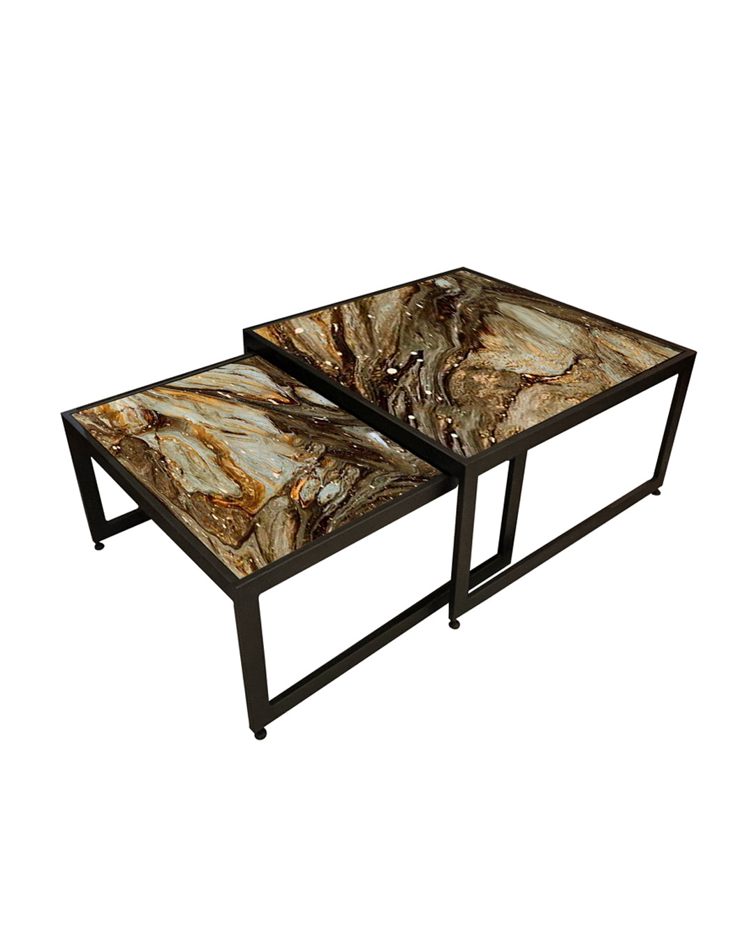 Elegante set de mesas decorativas de metal con cubierta de vidrio pintado a mano a base de una técnica de resinas.