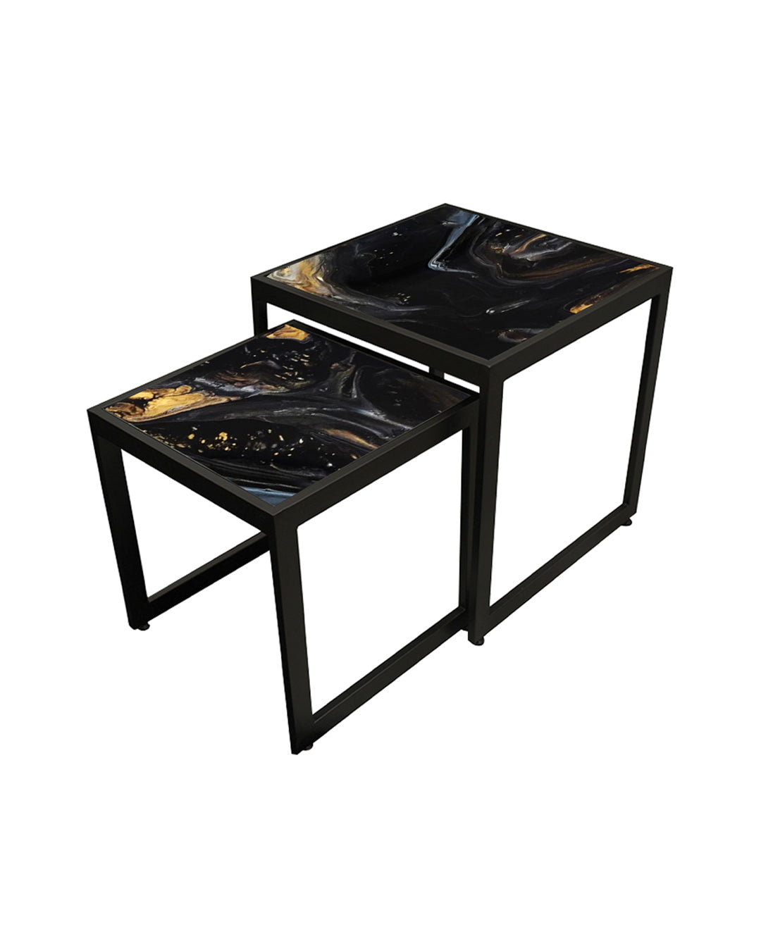 Elegante set de mesas decorativas de metal con cubierta de vidrio pintado a mano a base de una técnica de resinas.