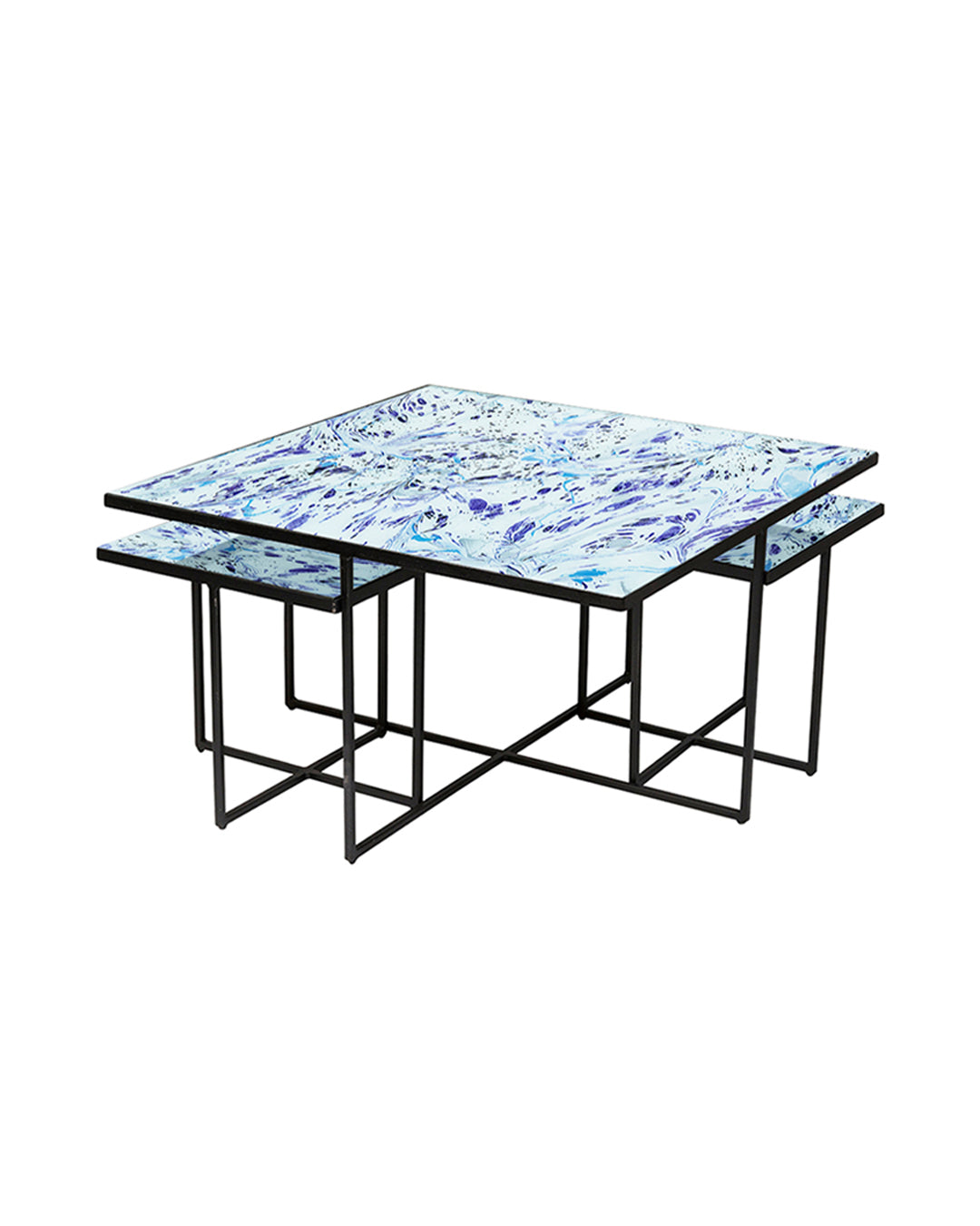 Elegante set de mesas decorativas de metal con cubierta de vidrio pintado a mano a base de una técnica de resinas.