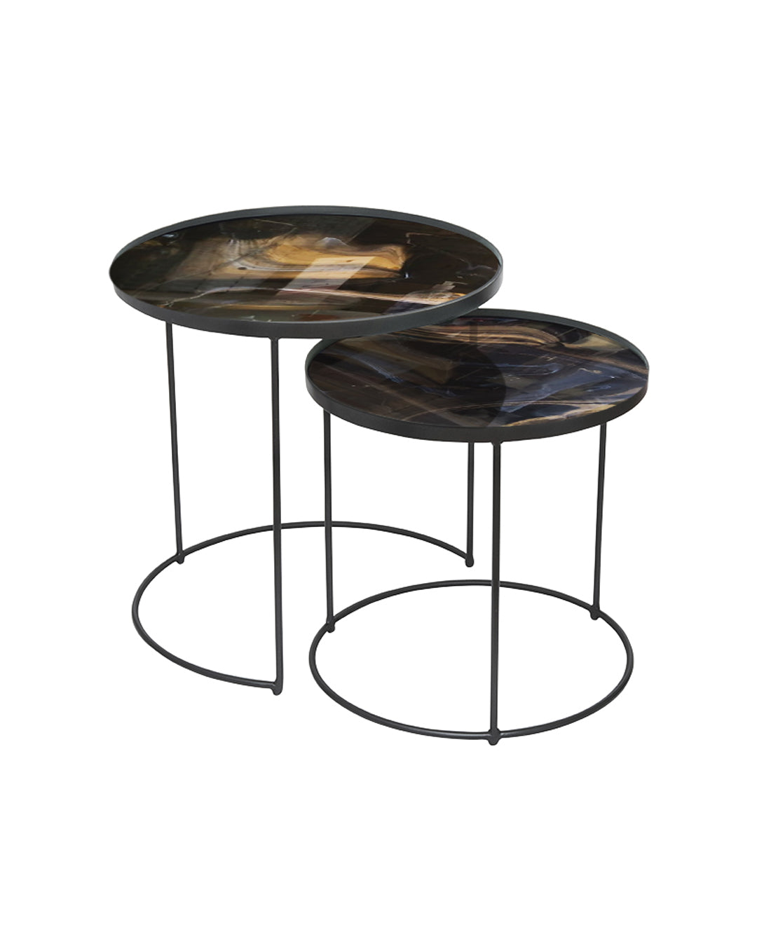 Elegante set de mesas decorativas de metal con cubierta de vidrio pintado a mano a base de una técnica de resinas.